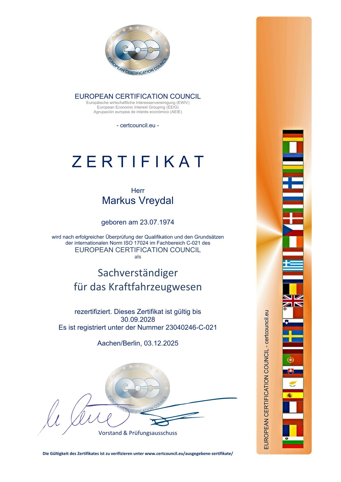 Bilanzkauf, Erbschaft oder Scheidungsangelegenheit erfordern regelmäßig eine professionelle Bewertung. Der zertifizierte KFZ Sachverständige Markus Vreydal regelt!